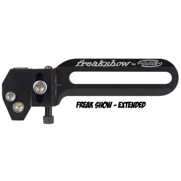 The “FREAKSHOW” is the toughest micro-adjustable target rest on the market today. It utilizes Jesse “The FreakShow” Broadwater’s unique torque tuning methodology, and it comes in either an extended or standard mount. AAE’s proprietary hex alignment launcher blade system is also featured allowing the archer to change out the blade without having to re-adjust their tune. The launcher arm rotates for the exact blade angle preferred. Laser-etched adjustment lines and oversized lock-down machine screws ensure adjustments are visible and rest in secure. The freakshow comes with two different original length launcher blades to help the elite target archer adjust for the perfect tune; standard width in .010″ thickness installed and wide width in .012″ thickness. Freakshow components are Stainless Steel.