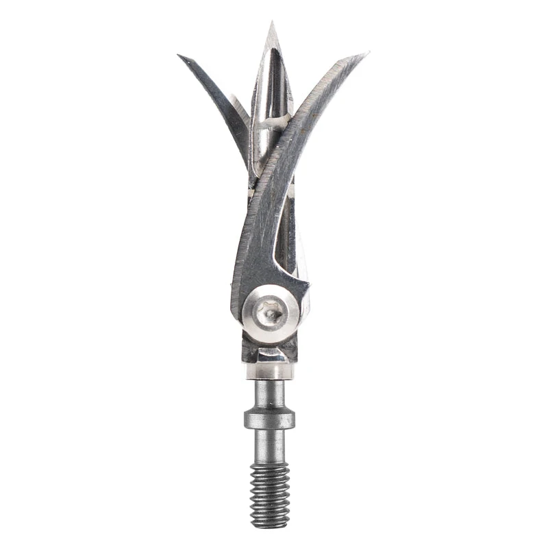 B3’s Exoskeletal Broadheads are stronger, straighter and superior — a patent-pending design built by archers and hunters, like you. The curved blades cut faster and penetrate longer. A combination of blades lying flat and a friction grommet under the blades eliminates external bands, and produces a quiet flight and field-tip accuracy. The pre-loaded blade angle is quick to deploy, and the head design features built-in stops for both closed and open positions, preventing arrow damage.