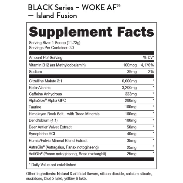 WOKE AF™ is not for beginners, rookies, or people who curl in the squat rack. This stim heavy dose has been formulated for those with only the strongest of tolerances. 3 different stimulants combined with clinically proven cognition enhancers, and a potent delivery mechanism will help you stay WOKE through the most intense workouts, longest work shifts, graveyards, study sessions, (or simply crushing your enemies, seeing them driven before you, and hearing the lamentation of their people).*
