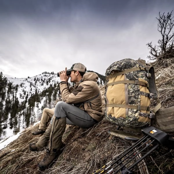 External features include extended-depth stretchable pockets to retain drink bottles, spotting scopes, trip-pods, etc. The center front panel utilizes the same stretchable material to create a zippered pocket for items requiring frequent access. Internal features maintain the Vapor Series’ simplicity, with an elastic retained side wall pocket on either side of the pack, dual hydration bladder hangers, and a hydration hose port. The Vapor also comes neatly packaged in a mesh zipper pocket which can be used for gear organization inside of the Vapor after purchase.Â