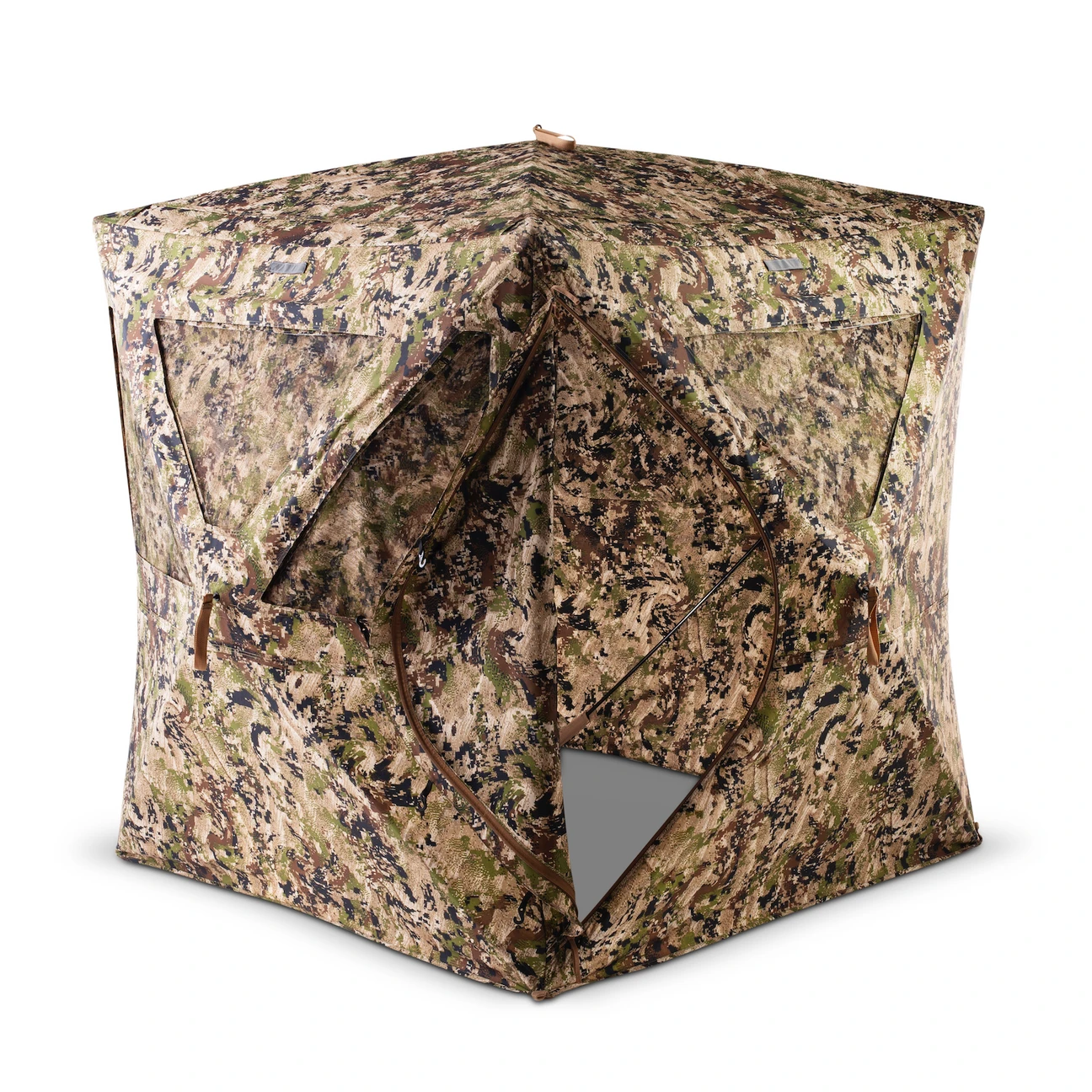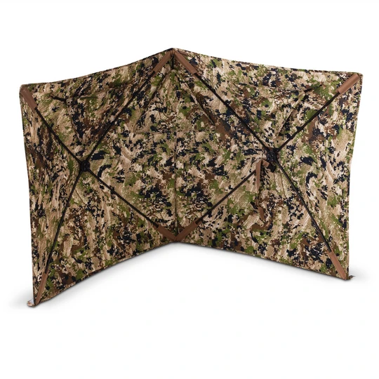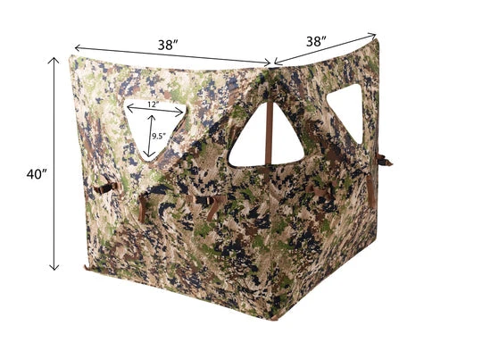 HydeOut™ Go is a compact, run-and-gun, two-hub blind that’s perfect for turkey, deer, elk, antelope or other pursuits where minimal gear is desired and hiding is required. Features camo material on the front AND reverse to keep you concealed when something approaches from behind. For added concealment we’ve added a stubble strap system on the front to attach native vegetation for even more hideablity. Each blind includes metal tent stakes for stability in high-wind conditions and a durable camo carrying case with a heavy duty shoulder strap to help you sneak quietly through the woods.