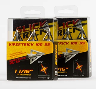 The new for 2017 SlickTrick Pro Series ViperTrick uses an all stainless steel construction. These broadheads penetrate further and do more damage than ever before. Best yet, because they resist corrosion, you never have to worry about having a sharp edge.Â