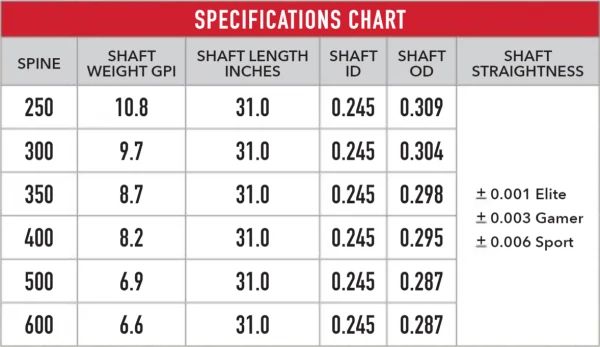 STANDARD DIAMETER ARROW – .245 STANDARD DIAMETER 100% CARBON FIBER CONSTRUCTION FOR INCREASED DURABILITY AND CONSISTENCY.
