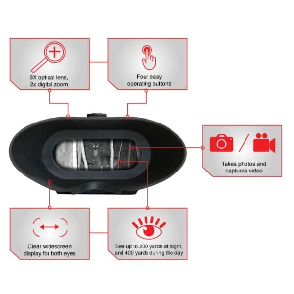 There’s no need to slow down at sundown with our XANB40 Hands-Free Night Vision Deluxe Binoculars. The electronic view finder uses 2x digital zoom to offer 400 yards of daytime observation and 55 yards in total darkness. The F1.4 aperture and IR LED enable you to capture photos and videos of the action for sharing later. Package comes with a padded neck strap, micro USB cable, and head piece accessories.